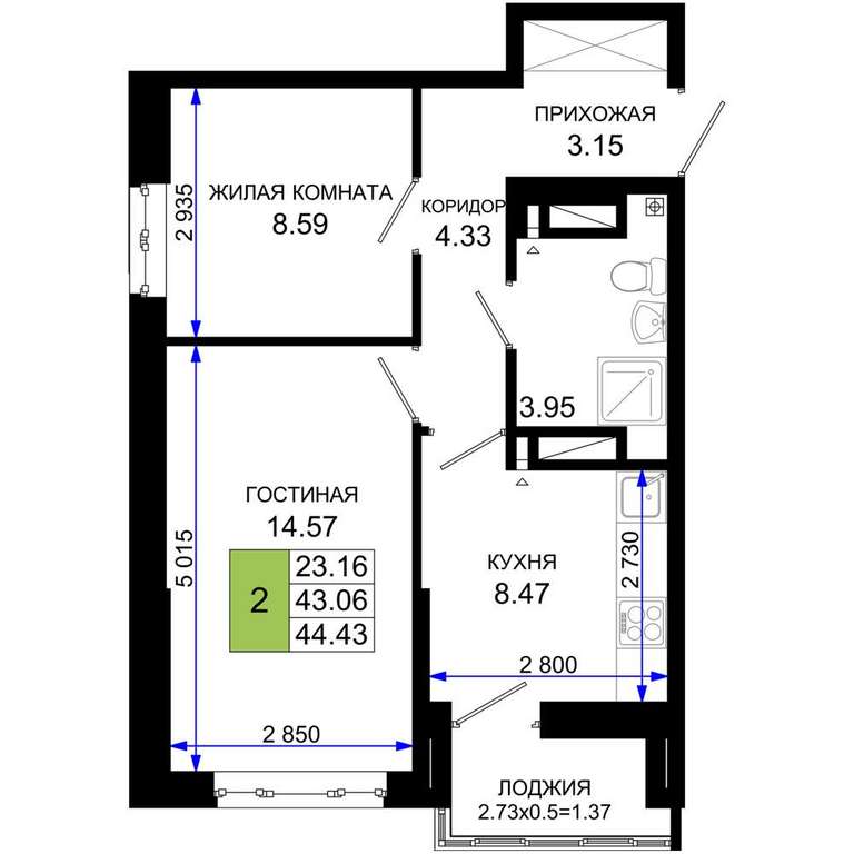 Жилая площадь 23.16 м2, кухня 8.47 м2, предчистовая отделка.