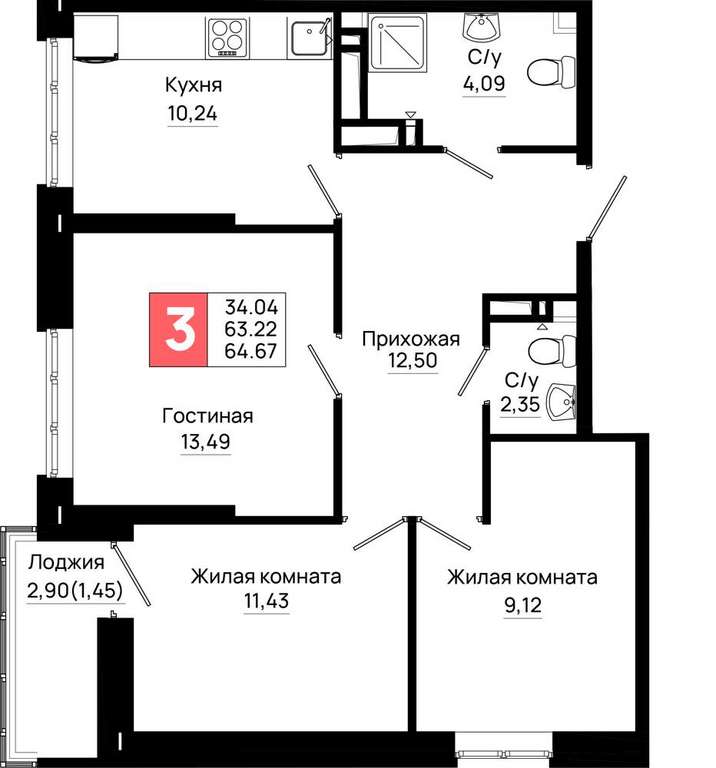 Жилая площадь 34.04 м2, кухня 10.24 м2, предчистовая отделка.