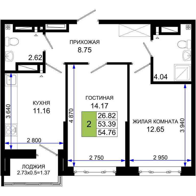 Жилая площадь 26.82 м2, кухня 11.16 м2, предчистовая отделка.