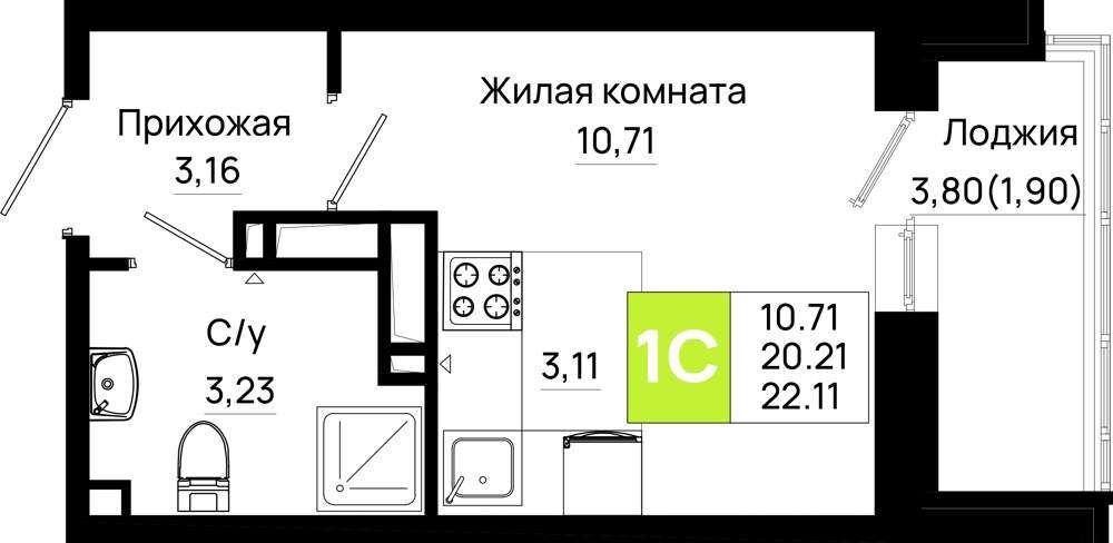 Жилая площадь 10.71 м2, кухня 3.11 м2, предчистовая отделка, комнаты смежные.