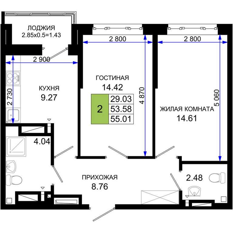 Жилая площадь 29.03 м2, кухня 9.27 м2, предчистовая отделка.