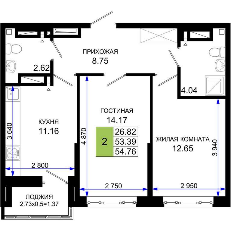 Жилая площадь 26.82 м2, кухня 11.16 м2, предчистовая отделка.