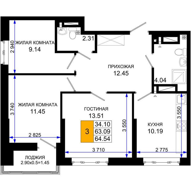 - 64.54 м2
