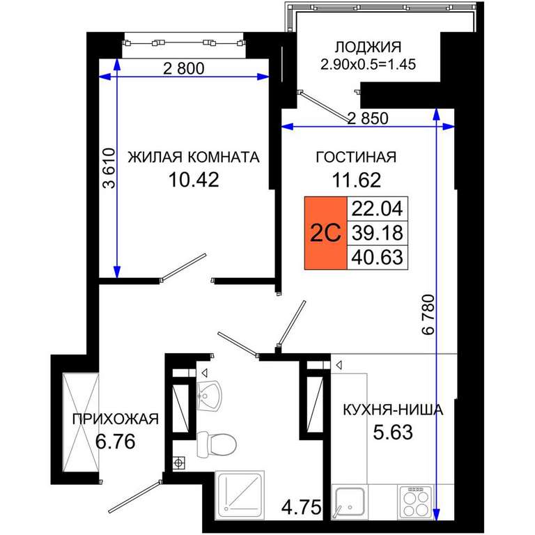 Жилая площадь 22.04 м2, кухня 5.63 м2, предчистовая отделка, комнаты изолированные.