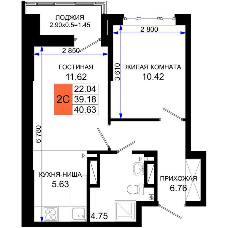 Жилая площадь 22.04 м2, кухня 5.63 м2, предчистовая отделка, комнаты изолированные.