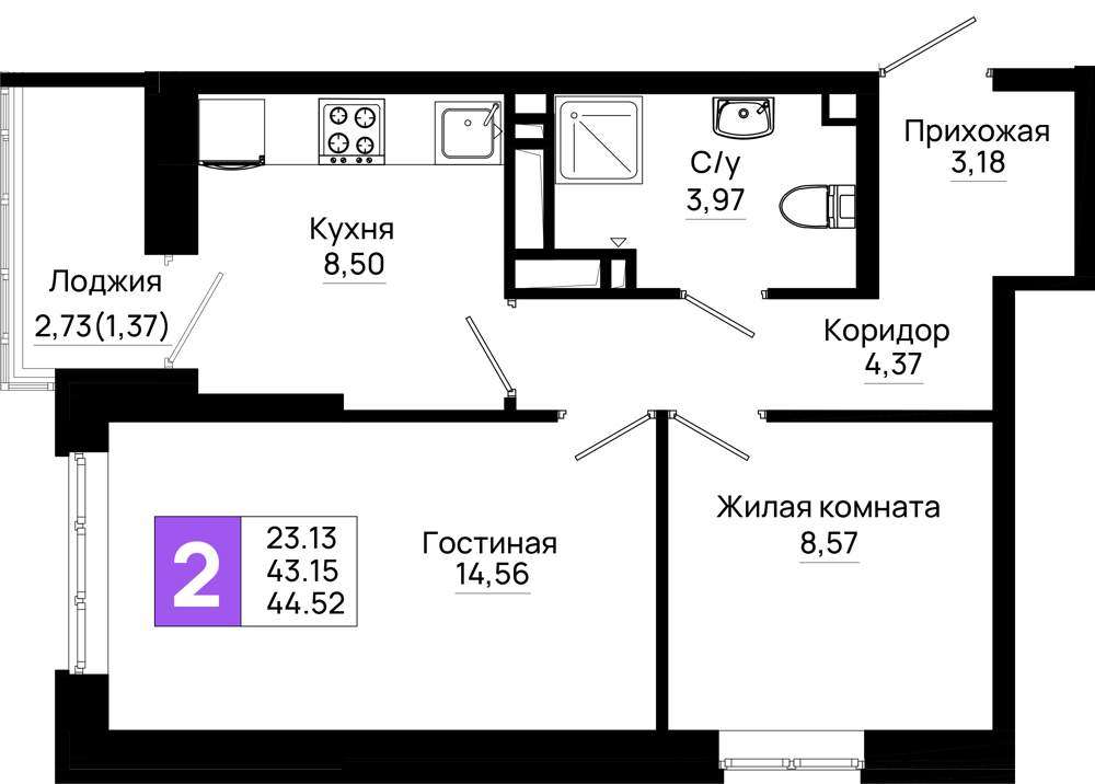 Жилая площадь 23.13 м2, кухня 8.5 м2, предчистовая отделка.