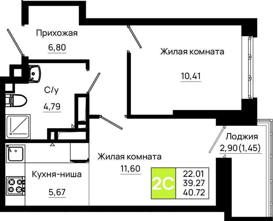 Жилая площадь 22.01 м2, кухня 5.67 м2, предчистовая отделка, комнаты изолированные.