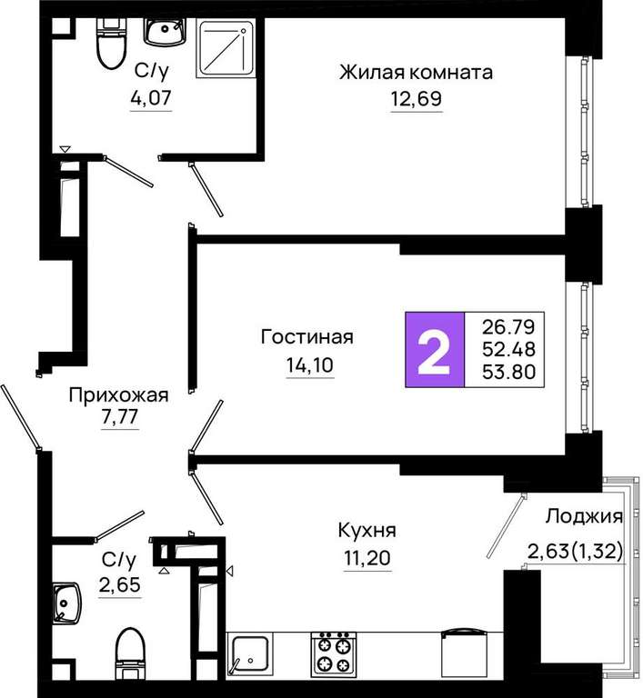 Жилая площадь 26.79 м2, кухня 11.2 м2, предчистовая отделка.