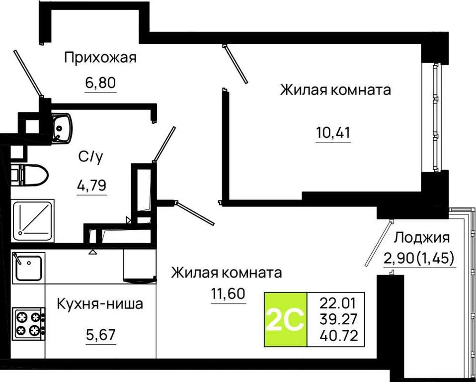 Жилая площадь 22.01 м2, кухня 5.67 м2, предчистовая отделка, комнаты изолированные.