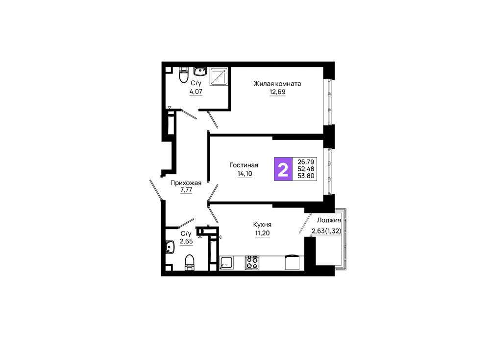 Жилая площадь 26.79 м2, кухня 11.2 м2, предчистовая отделка.