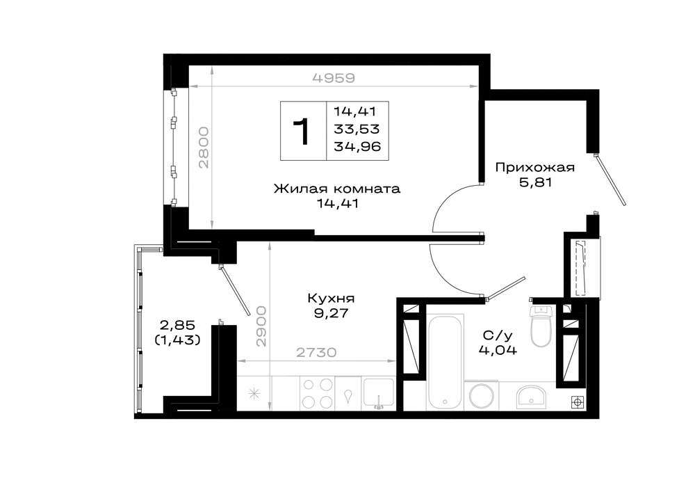 Жилая площадь 14.41 м2, кухня 9.27 м2, предчистовая отделка, комнаты изолированные.