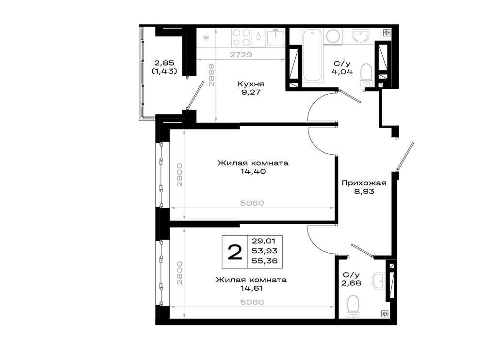 Жилая площадь 29.01 м2, кухня 9.27 м2, предчистовая отделка.