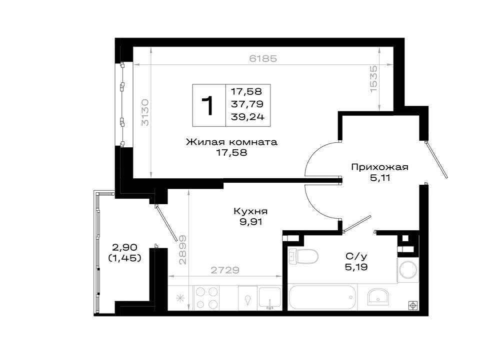 Жилая площадь 17.58 м2, кухня 9.91 м2, предчистовая отделка, комнаты изолированные.