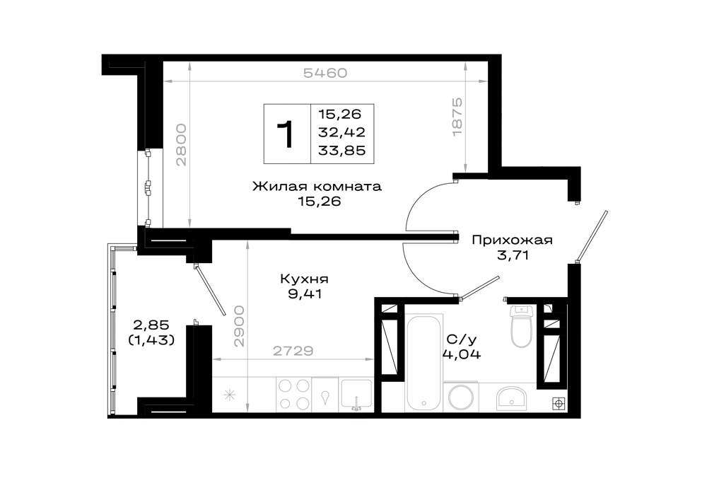 Жилая площадь 15.26 м2, кухня 9.41 м2, предчистовая отделка, комнаты изолированные.