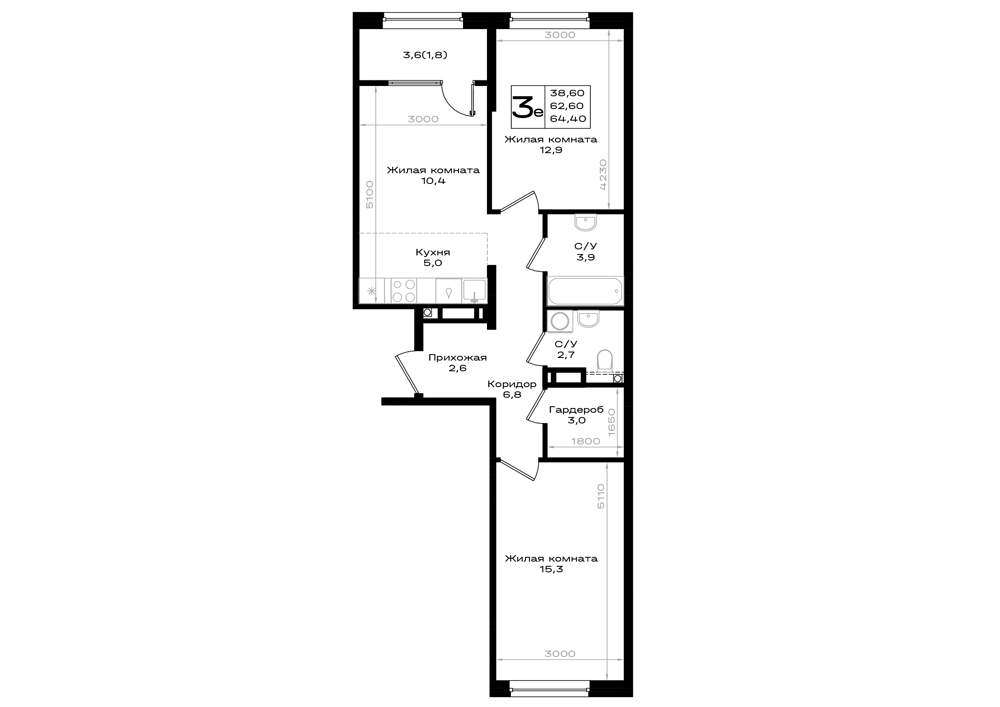 Жилая площадь 38.6 м2, кухня 5 м2, квартира без отделки.
