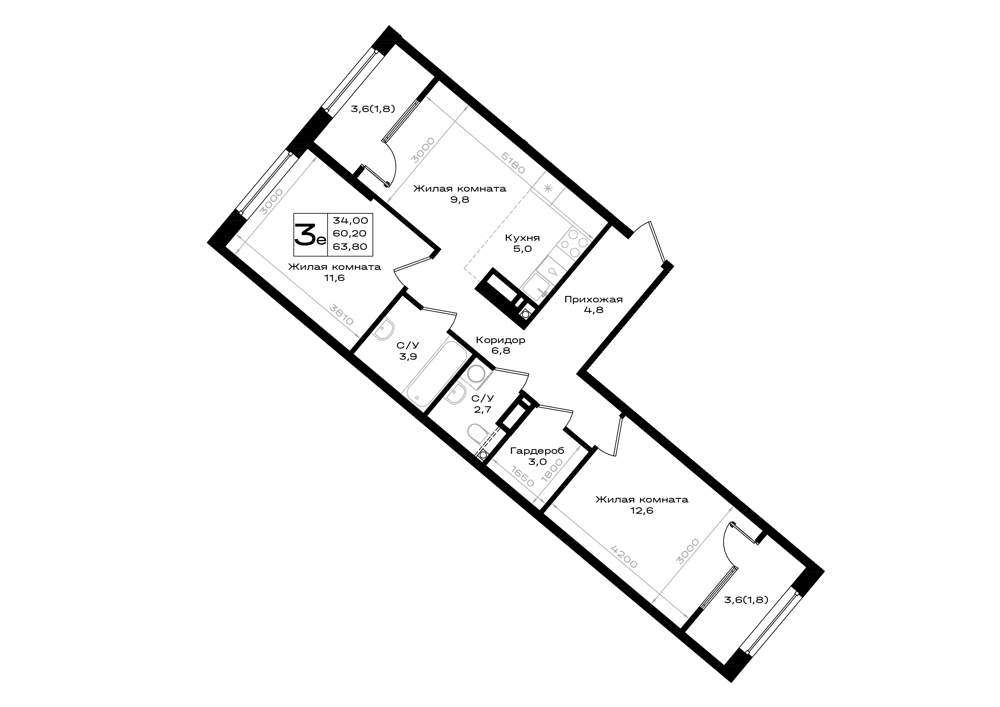 Жилая площадь 34 м2, кухня 5 м2, квартира без отделки.