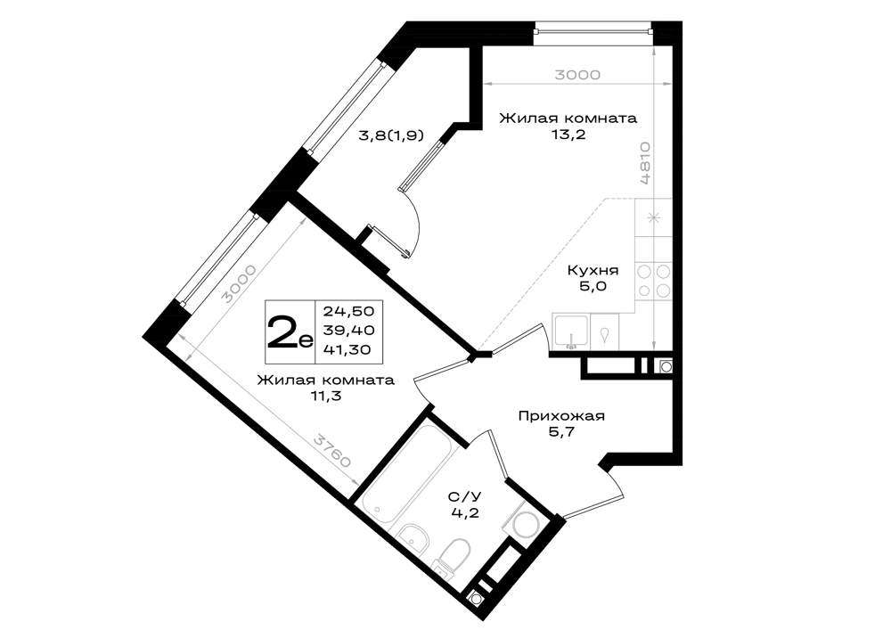 Жилая площадь 24.5 м2, кухня 5 м2, квартира без отделки.