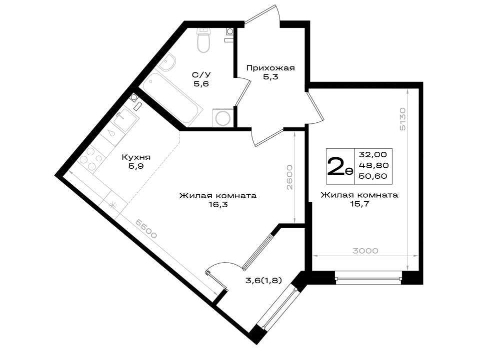 Жилая площадь 32 м2, кухня 5.9 м2, квартира без отделки.