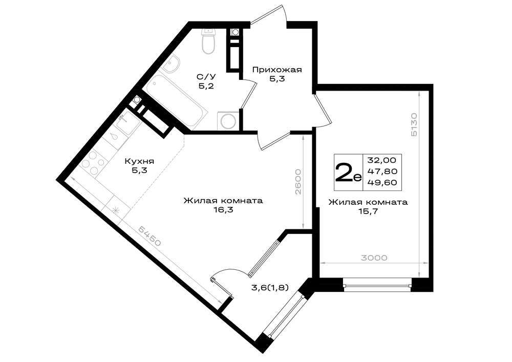 Жилая площадь 32 м2, кухня 5.3 м2, квартира без отделки.
