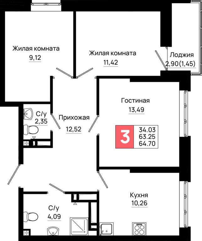 Жилая площадь 34.03 м2, кухня 10.26 м2, предчистовая отделка.