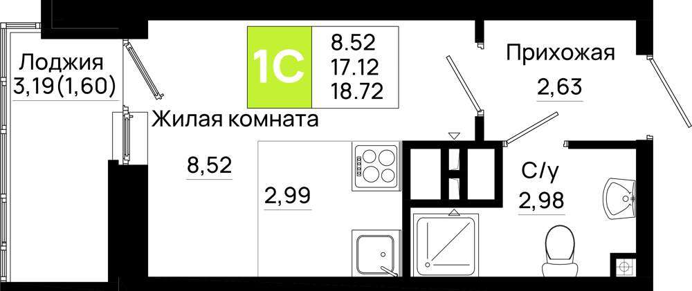 Жилая площадь 8.52 м2, кухня 2.98 м2, предчистовая отделка, комнаты смежные.