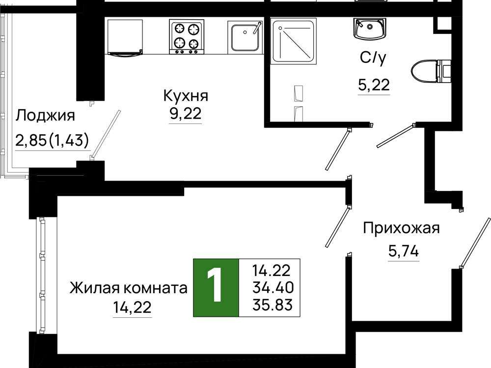 Жилая площадь 14.22 м2, кухня 9.22 м2, предчистовая отделка, комнаты изолированные.