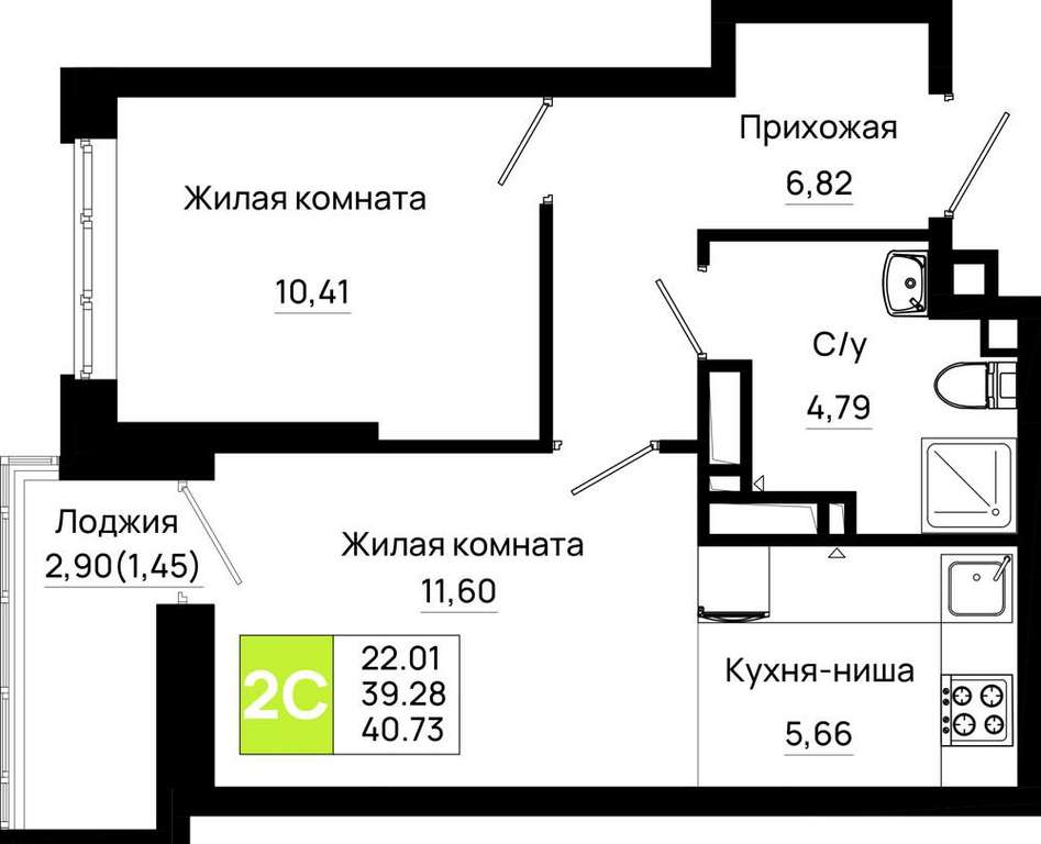 Жилая площадь 22.01 м2, кухня 5.66 м2, предчистовая отделка, комнаты изолированные.
