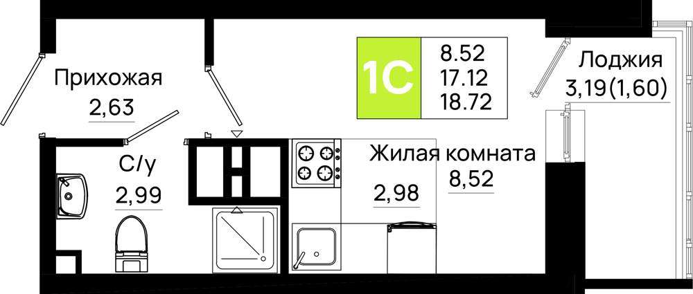 Жилая площадь 8.52 м2, кухня 2.98 м2, предчистовая отделка, комнаты смежные.
