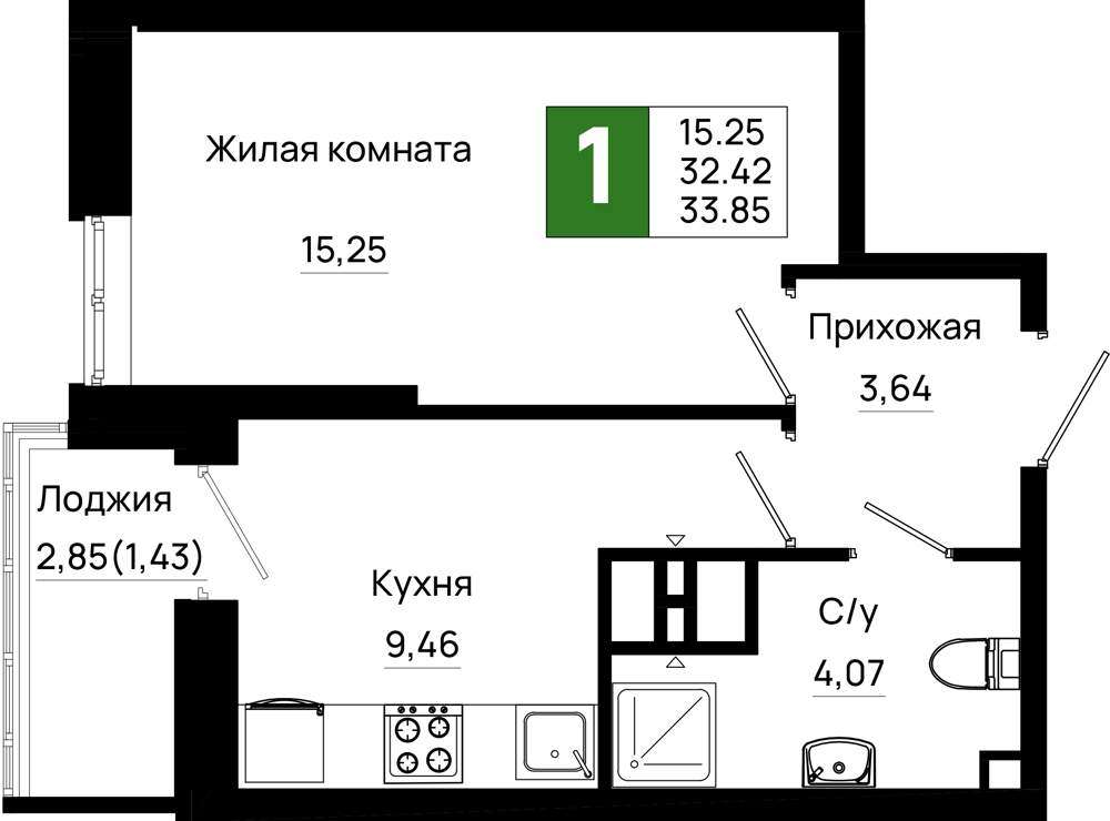 Жилая площадь 15.25 м2, кухня 9.46 м2, предчистовая отделка, комнаты изолированные.