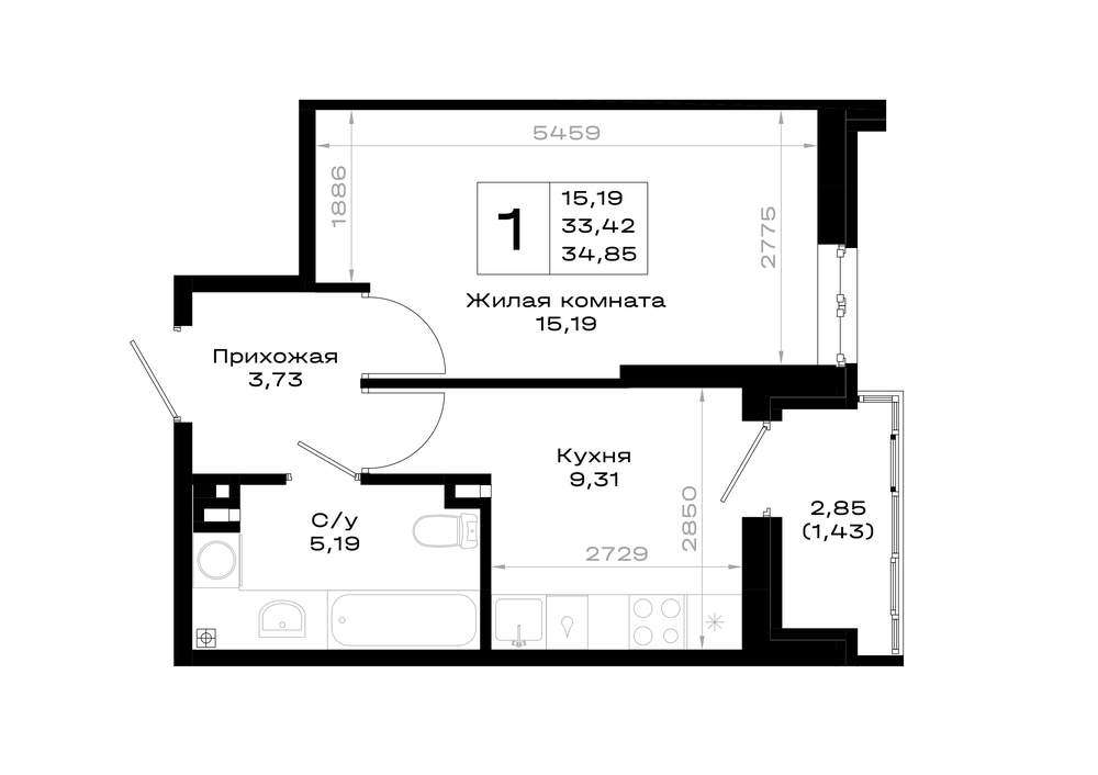 Жилая площадь 15.19 м2, кухня 9.31 м2, предчистовая отделка, комнаты изолированные.
