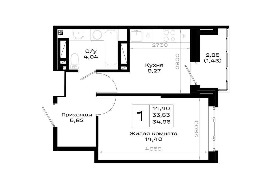 Жилая площадь 14.4 м2, кухня 9.27 м2, предчистовая отделка, комнаты изолированные.