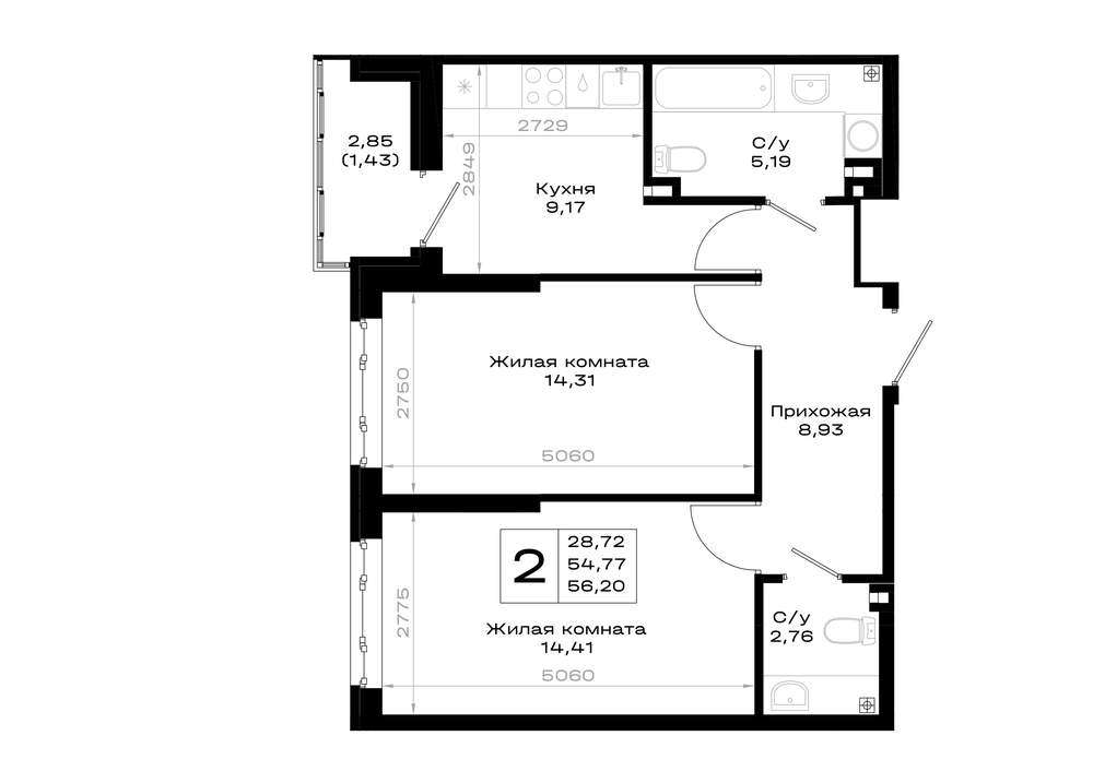 Жилая площадь 28.72 м2, кухня 9.17 м2, предчистовая отделка.