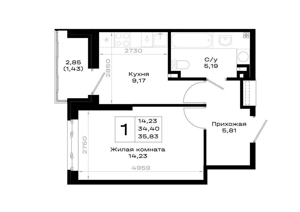 Жилая площадь 14.23 м2, кухня 9.17 м2, предчистовая отделка, комнаты изолированные.