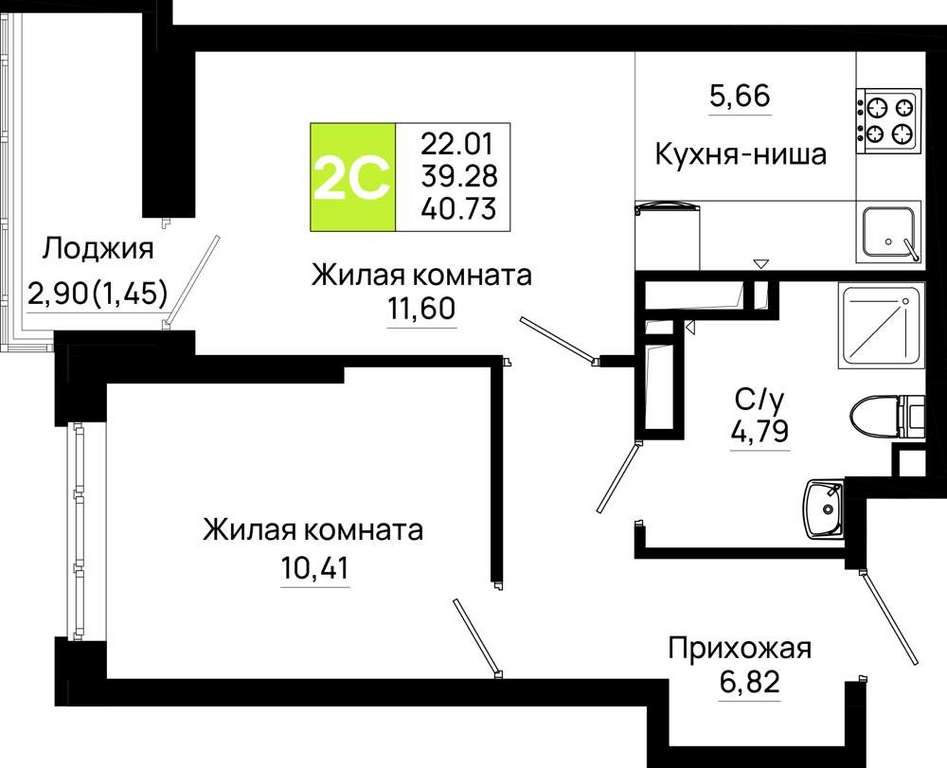 Жилая площадь 22.01 м2, кухня 5.66 м2, предчистовая отделка, комнаты изолированные.