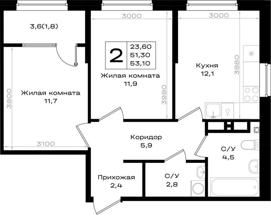 Жилая площадь 23.6 м2, кухня 12.1 м2, квартира без отделки.